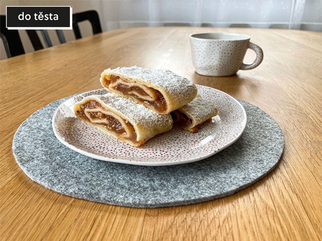 TIP: Přidejte si tam ořechy, páč já je do sklenice nedala, na štrůdlu mají křupat, a já se bála, aby nějak při zavařování velkých kusů nezlobily. Jo a posypejte to před pečením strouhankou - nevím proč, ale tato rada mojí mámy je k nezaplacení. Štrůdl bez strouhanky chutná jak dětská výživa.